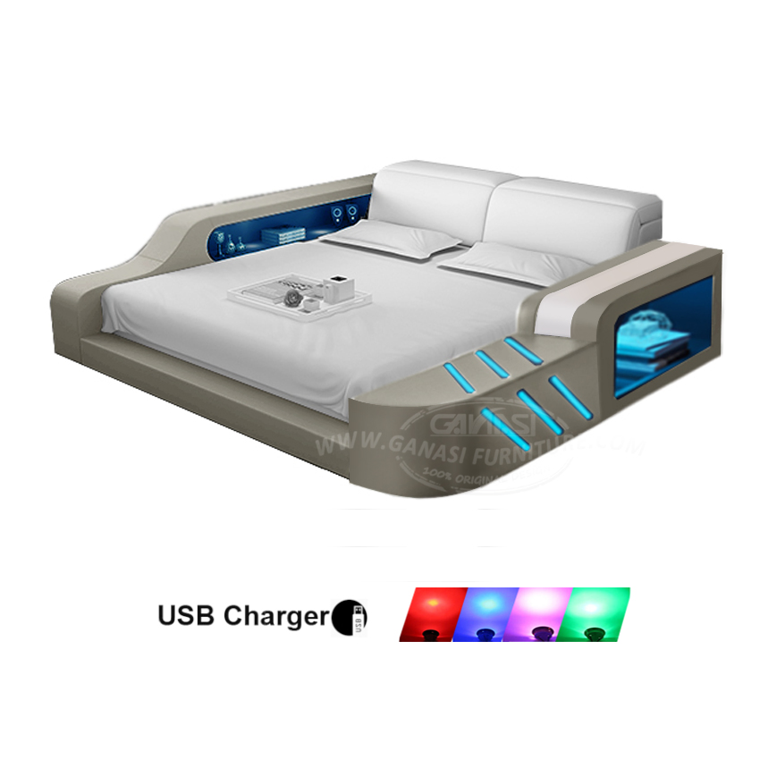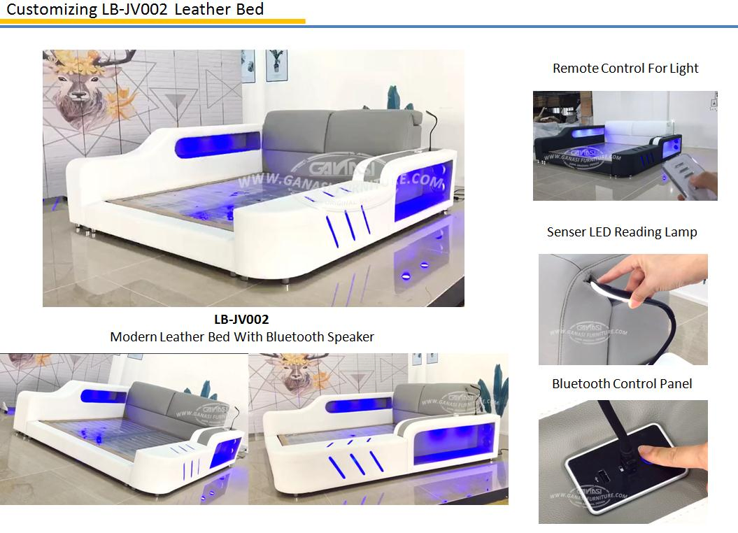 Top Fashion Home Bedroom Furniture Leather Bed (LB-JV002)GANASI FURNITURE- Modern // Unique // LED Bed // Big Storage -GANASI King / Queen Bed Designs is very hot sale in Europe, America, Australia, New Zealand, a good choice for your home, Villa, Hotel, Apartment design etc. Adjustable headrest des......