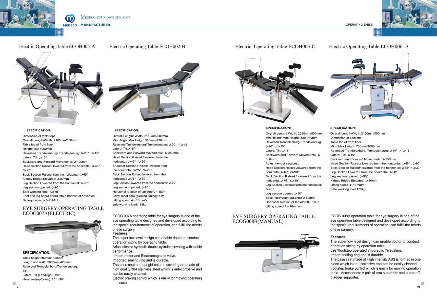 Manual Operation TableECOG023ECOG023 operation table is suitable for various operations conducted by medical unit.Features:Operation table ECOG023 type base seat and upright column covering are made of high quality 3004 stainless steel.Adopting manual screw rod to elevate operation table.The rear pl......