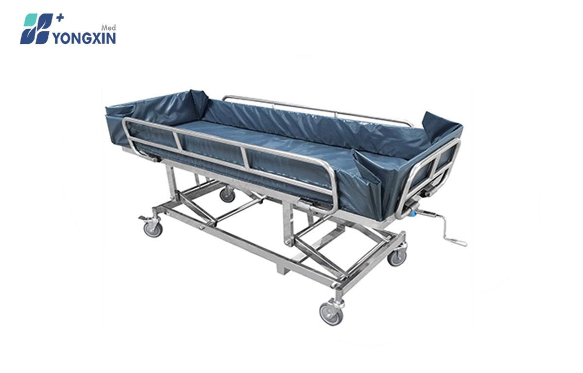 YX-5 Manual bath bed for Hospital·Size:1860*650*500-900mm·Stainless steel material·Height adjusted by crank·Four swivel castors, two with brake·Load bearing:200kgs