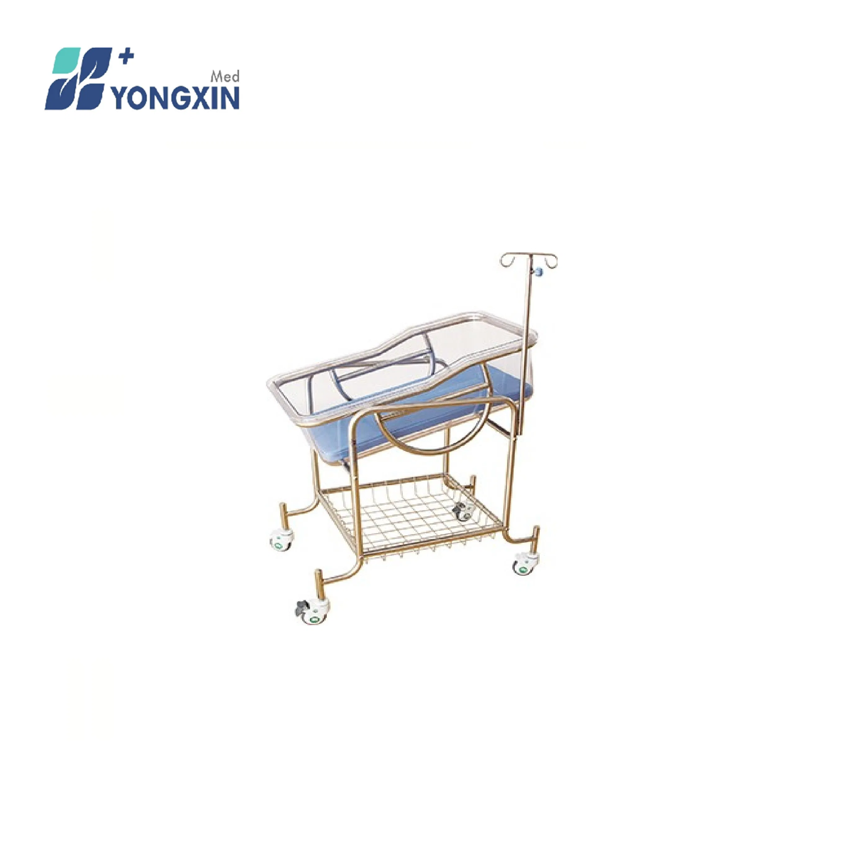 Yx-B-3 Hospital Use Powder Coated Steel Baby Bed·Size:870*540*890mm·Plastic bassinet·Height is adjustable by gas spring·Four swivel castors, two with brake